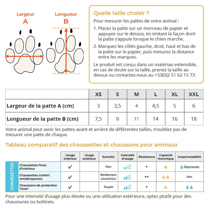 Cliquez sur le bouton orange “Quelle taille choisir ?” en haut de la page. Il vous indique comment prendre correctement les mesures et la taille correspondante aux dimensions de la patte de votre animal.